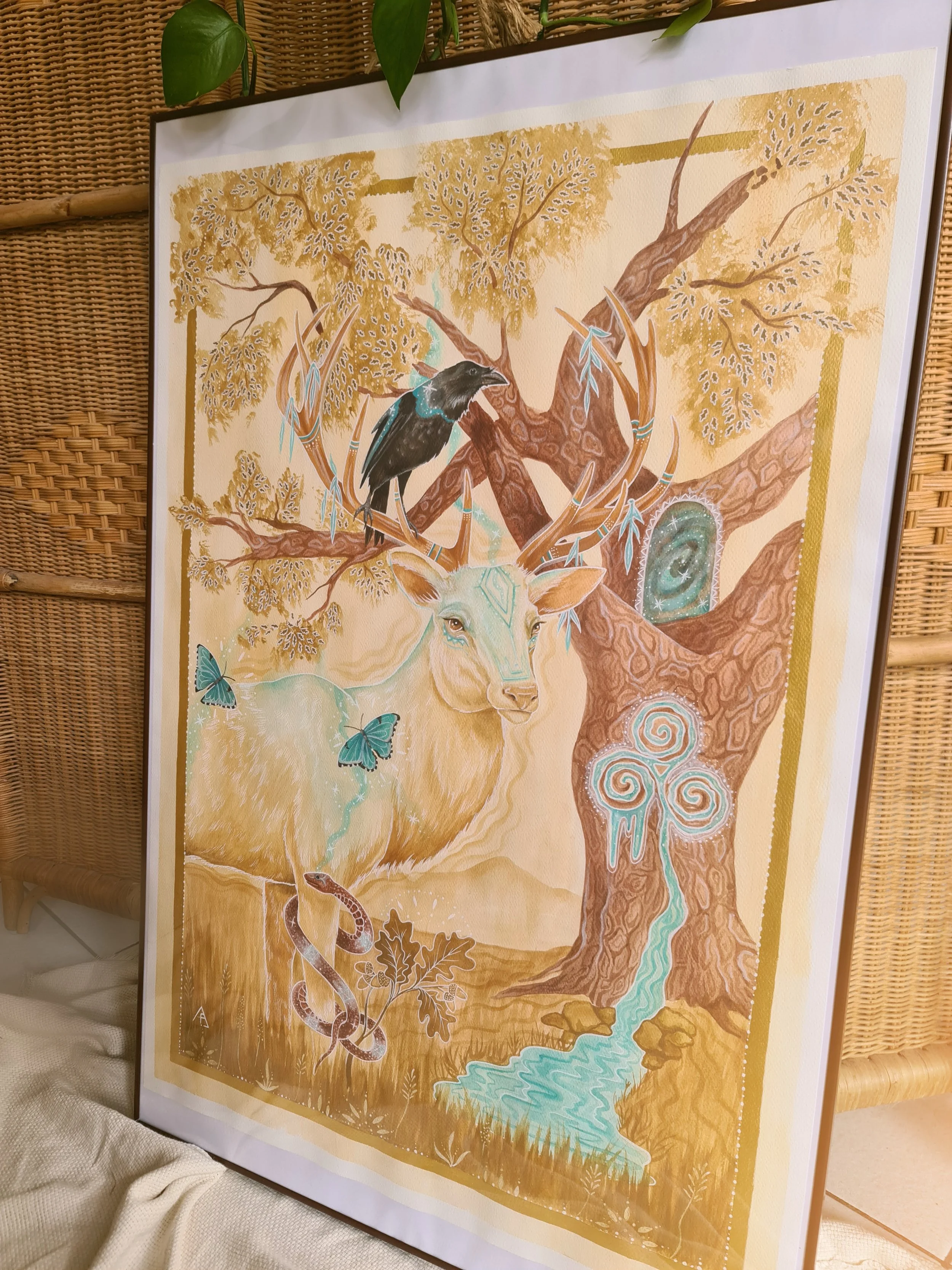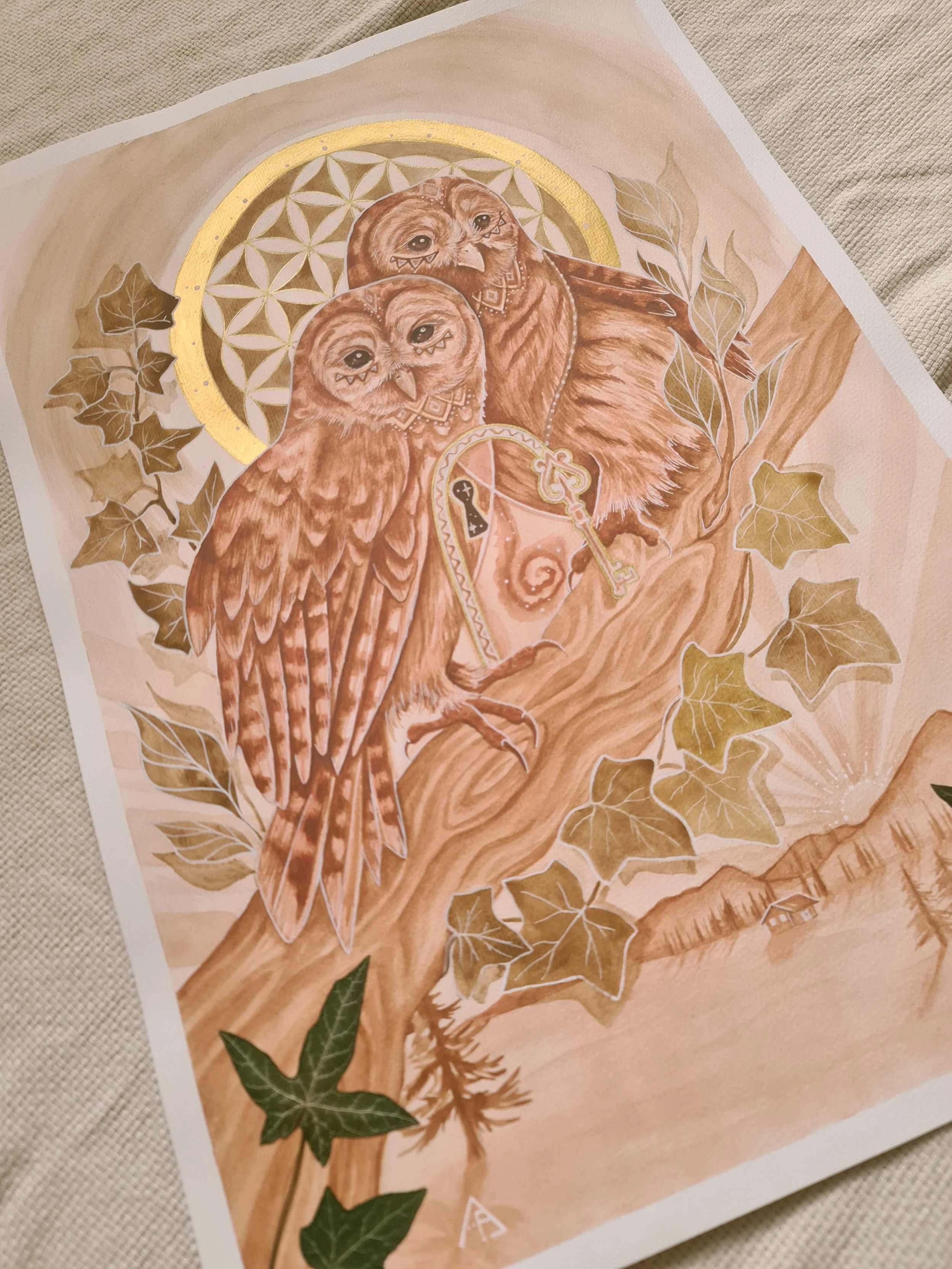 – Painted in Watercolor warm, earthy tones with golden shimmer accents